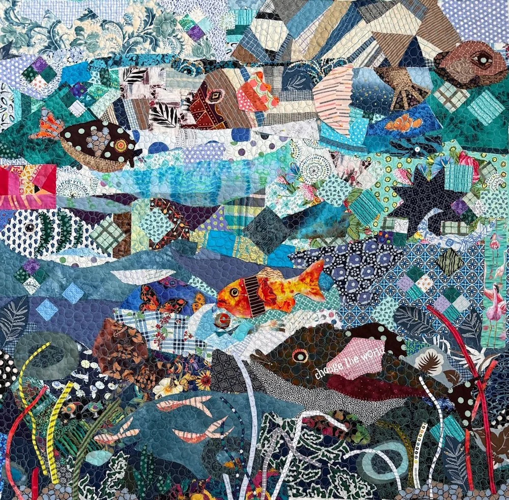 Eventually, I found myself with some ‘free’ time on my hands, and still SO MANY scraps, so I started a large underwater scene, which is still in production, and will be titled, ‘Change the World’. Some of these creatures are much more intriguing because they were originally irregular shapes in my scrap collections. The background was stitched completely in circles (referring to bubbles) and the individual fish and grasses, etc. are now being hand appliqued. The background went together fairly quickly since it was made with larger scraps and raw edge machine appliqued.