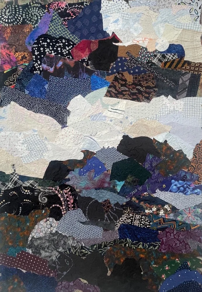 Normally, I would hand applique all the pieces for my art quilts and often hand quilt them as well. This was not possible with class deadlines and work expectations. So, one day, I grabbed a handful of dark scraps, arranged them (without ironing) onto a background of gray felt, and used a ‘loopy scribble’ stitch to machine sew those pieces down – puckers, wrinkles and all. I used a longarm quilting machine and was very careful not to stitch over any of my fingers. I didn’t bother to pin the pieces, so I had to chase a few around before I could catch them with the needle. Then I changed thread to a light neutral color, and stitched a random area of light scraps, followed by a section of medium value scraps.