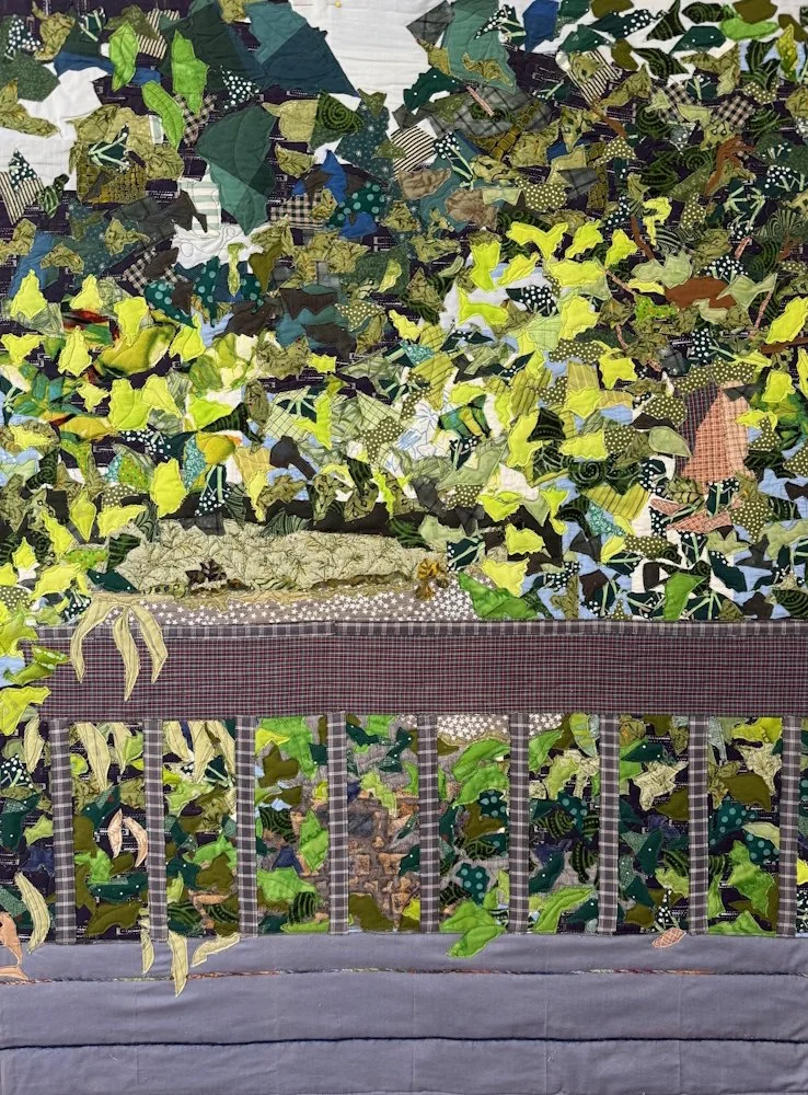Also in progress is a landscape that has been created for the most part with scrap green fabrics. This one has a blue and white vintage embroidered quilt as a base. Most of the vintage quilt is covered as it was in terrible condition and beyond repair. This one is taking much longer, because instead of scribbling, I am taking the time to outline stitch each leaf. And next, I will be ready to get back to scribbling, I think! Thankfully, my fingers are still intact, even after adding what seems like thousands of leaves.